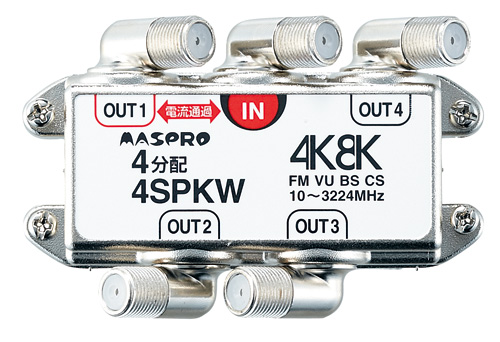 端子可動型の屋内用分配器。1端子電流通過型で4分配することができます。端子が左右に振れるのでF型コネクターを容易に取付け可能です。