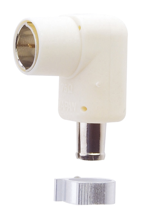 同軸ケーブルの先端に取付けるアンテナプラグ。L型のプッシングタイプです。5Cケーブル専用です。白色。CATV・FM・VHF・UHF・BS・CS。