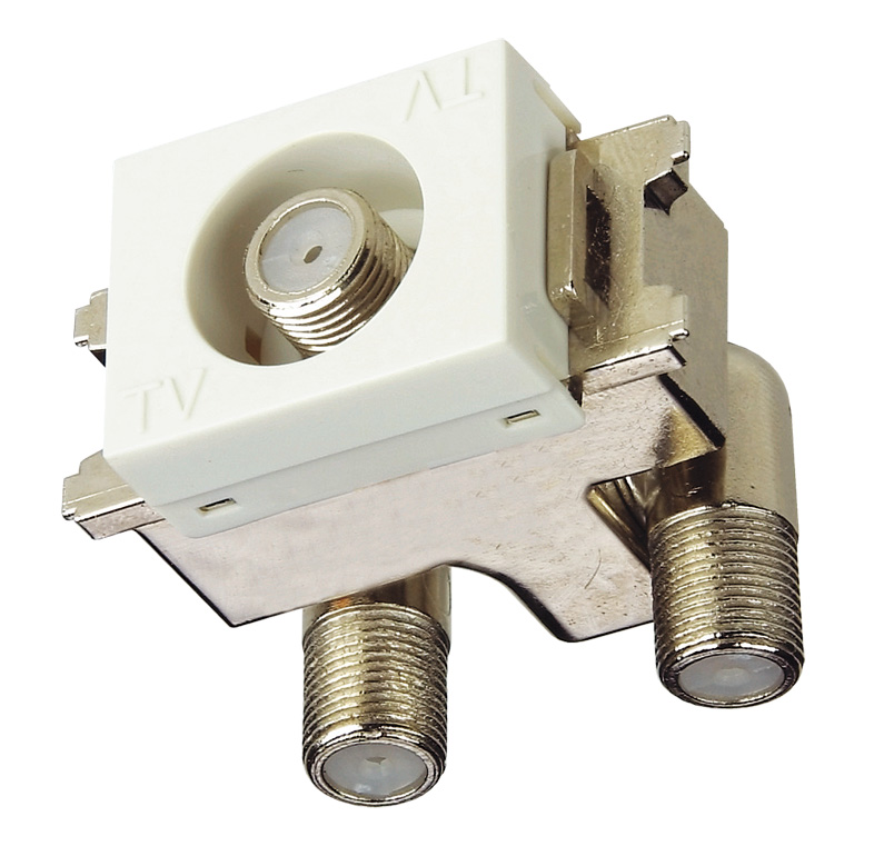 壁面に設置するテレビ端子数が1つの直列ユニット(コンセントプレート1個用)。スイッチボックス側にくる端子が可動するため、施工性に優れています。配線システムの中継用に使い、電流通過させる送り配線用の出力端子を備えています。