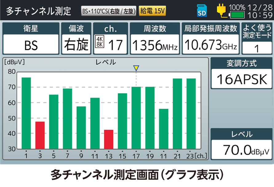 受信レベルに加え、信号品質をあらわすMER(C/N)、BERの測定と、デジタル変調の品質を視覚的に確認できるコンスタレーション表示により、精度の高いアンテナ調整が可能です。