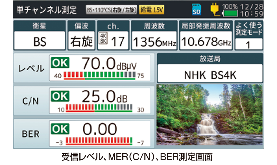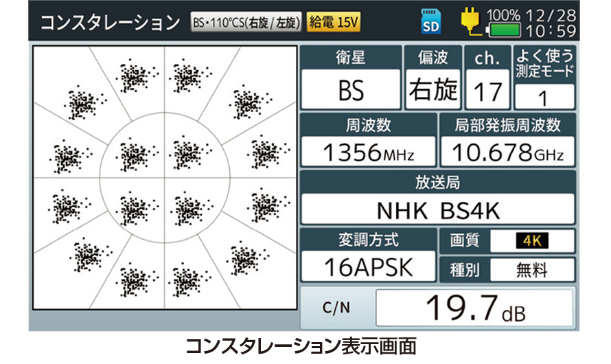 4K8K衛星放送の受信レベル、C/N、BER、コンスタレーション測定ができます。