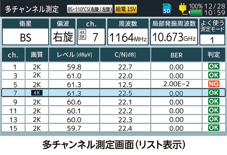 任意の放送サービスのチャンネルを指定して測定する機能で、計測チャンネルごとの受信レベル、MER(C/N)、BERを1画面に表示できます。