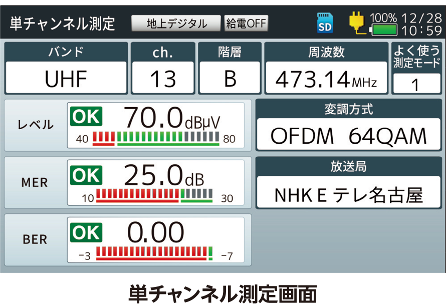 受信レベル、MER(C/N)、BERの各測定項目の横に判定マークが表示されるので、受信状況の判定が一目でわかります。(各判定条件は、設定より変更できます)