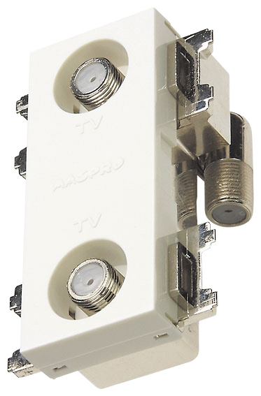 壁面に設置するテレビ端子数が2つの直列ユニット(コンセントプレート3個用、上り帯域カットフィルタースイッチ付)。スイッチボックス側にくる端子が可動するため、施工性に優れています。配線システムの端末用に使い、反射波の影響を軽減させるための75Ω終端回路を備えています。