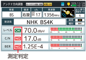 信号レベル、MER(C/N)、BERの各測定項目の横に判定マークが表示されるので、受信状況の判定が一目でわかります。(各判定条件は、任意に変更できます)