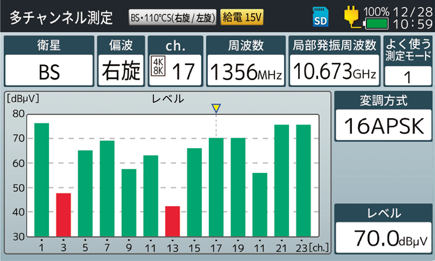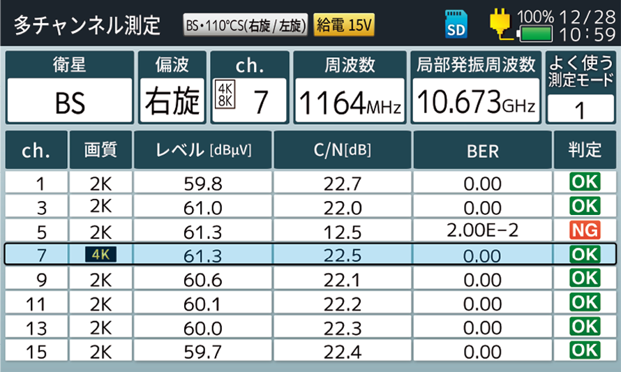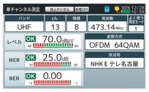 | 測定チャンネル | VHF:1~12 UHF:13~62 CATV:C13~C63 CATV2※1:C64~C101 スカパー!プレミアムサービス光:H001~H106 PILOT:70、73、75.5、91.25、109.25、148、246、288、298、300、301.25、349.25、 450、451.25、495.25、747.25、750、753.25、765.25、771.25MHz BS:1~24 CS:1~26 JCSAT-1C:1~28 JCSAT-2B:1~16 JCSAT-3A:JD1~JD28 JCSAT-4B:JD1~JD32 スーパーバードB3:1~23 スーパーバードC2:1~28 CATV(上り):10~ 60MHz FM:70~95MHz LTE(下り):773~803MHz 帯域幅10MHz、30MHz |