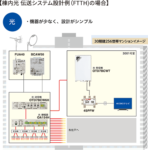 新4K8K衛星放送では、従来よりも高い周波数が使用されるため、伝送損失が大きくなります。高層マンションなどの大規模施設では、ブースターの多段カスケード接続となるなど、同軸伝送システムでは設計が複雑になります。光 伝送システムは、ケーブル伝送損失がほとんどありませんから、大規模施設でも設計・施工がシンプルで全ての住戸に安定した信号を伝送することができます。