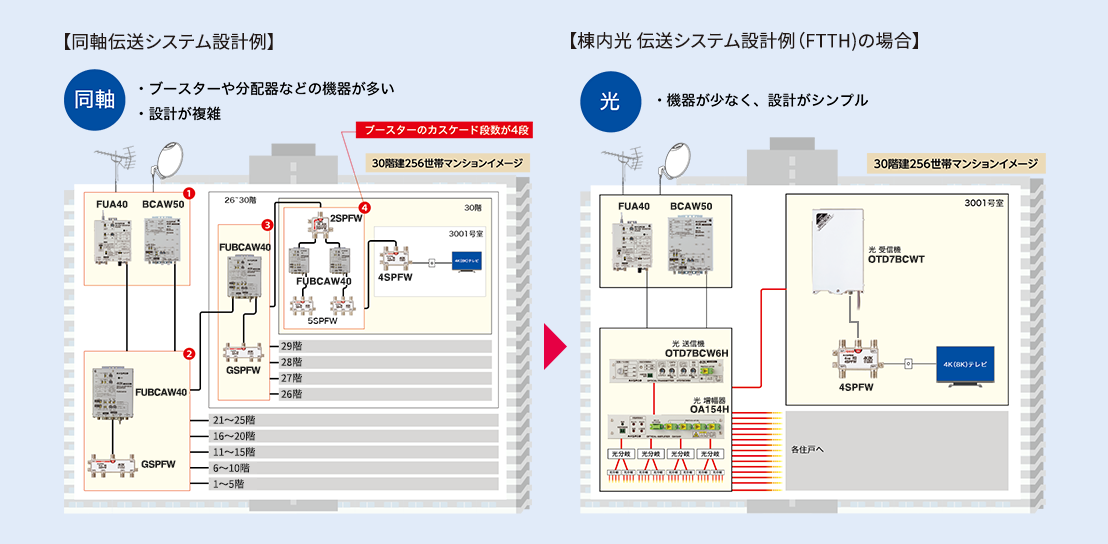 同軸ケーブルシステムとの設計比較30階建256世帯のマンションの場合